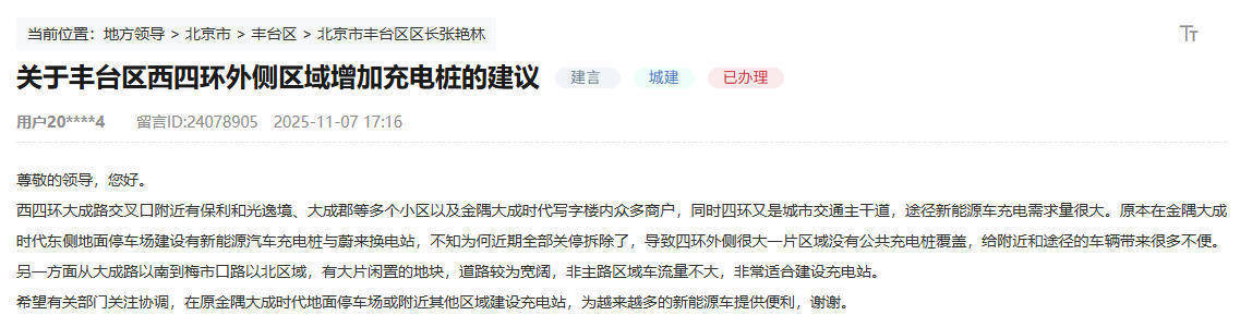 人民网北京1月18日电(记者鲍聪颖)近日,有北京网友在人民网“领导留言板”上留言,建议丰台区西四环外侧区域增加充电桩。该网友表示:西四环大成路交叉口附近有保利和光逸境、大成郡等多个小区以及金隅大成时代写字楼内众多商户,同时四环又是城市交通主干道,新能源车充电需求量很大。