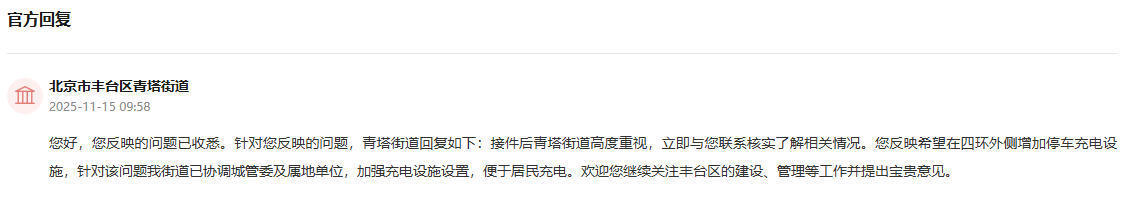 对此,北京市丰台区青塔街道高度重视云谷策略,立即与该网友联系,核实了解相关情况,并回复:针对在四环外侧增加停车充电设施问题,街道已协调城管委及属地单位,加强充电设施设置,便于居民充电。
